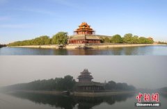 10月10日,北京故宫角楼被雾霾笼罩,与蓝天白天映衬下的故宫角楼形成了鲜明的对比。中新社发郭俊锋摄图片来源:CNSPHOTO10月10日消息,霾预警四连发,自1...
