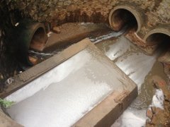 ①圆形天井中泾渭分明的污水,左侧排出红褐色污水的管道与垃圾渗滤液处理厂房后的沟渠相连。②下坪填埋场渗滤液收集池一侧的雨水沟,褐色的污水沿坡体和垃圾堆体汇入其中。...