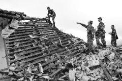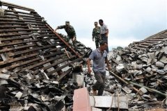 昨日,救援人员在卡场镇吾排村清理景颇族村民勇巴麻家被毁的房屋。新华社发记者从云南省民政厅获悉,发生在盈江县境内的5.6级地震,截至10时已造成8人受伤,均为轻伤...