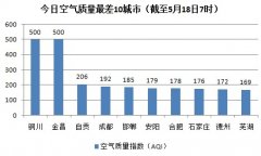 人民网北京5月18日电(记者蒋琪)根据环保部公布的最新数据,截至今日早上7时,铜川、金昌的AQI(空气质量指数)达到500,属于严重污染,成为161个参与空气质...