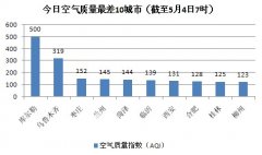 人民网北京5月4日电(记者蒋琪)根据环保部公布的最新数据,截至今天早上7时,库尔勒的AQI(空气质量指数)500,属于六级严重污染,成为161个参与空气质量排名...