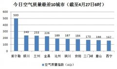 人民网北京4月27日电(记者蒋琪)根据环保部公布的最新数据,截至今日早上6时,继25日、26日之后,库尔勒的AQI(空气质量指数)再次“爆表”达到500,属于严...