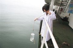 17日,曹妃甸港,工作人员正在对海水进行取样。一名工人捧起气浮池内海水的气泡观察气浮效果。通过这道程序,海水中的污染物会被过滤掉。两名工人正在记录超滤系统各个读...