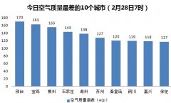 人民网北京2月28日电(杨翼)今日全国空气普遍较好,根据环保部公布的最新数据,截至今天早上7时,邢台的AQI(空气质量指数)为170,属于中度污染,成为161个...