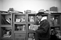 昨日,胡钧在纸板做成的书架旁翻书。本报记者 周岗峰 摄 本报讯(记者刘珍妮)丰台区育仁里社区的退休教师胡钧用10年时间,将自家改造成低碳小屋。近日,这间含有10...