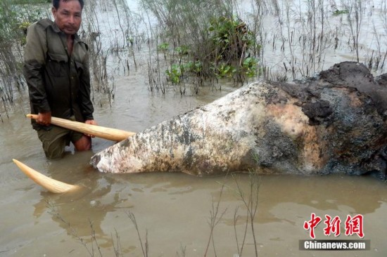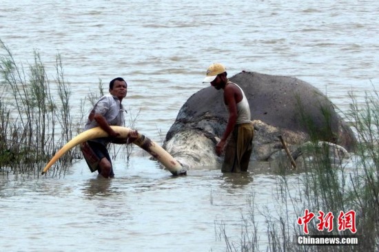 当地时间2014年8月3日,印度阿萨姆邦那冈区,雅鲁藏布江中发现一头野象的尸体,林业部门官员正在检查象牙。据称,这头野象的象鼻已经被偷猎者割掉了。 图片来源:东方IC 版权作品 请勿转载