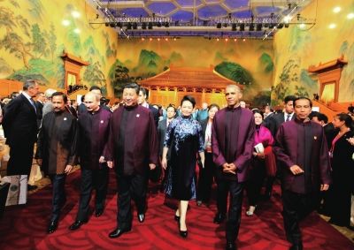 领导人及配偶步入宴会大厅。新华社发 原标题:“相信通过努力APEC蓝能保持” 昨晚,国家主席习近平和夫人彭丽媛在水立方举行宴会,欢迎出席亚太经合组织第二十二次领导人非正式会议的各成员经济体领导人、代表及配偶。出席加强互联互通伙伴关系对话会的有关外国领导人及配偶应邀出席。 综合新华社央视中新京华时报记者潘珊菊陈荞 □致辞 习近平妙语连珠迎嘉宾 昨晚,身着深紫色特色中式服装的中国国家主席习近平,在“水立方”游泳场馆改造成的宴会厅开始了一段近15分钟的致辞,妙语连珠。 到北京“有缘千里来相会” “大家不远万里来到北京,用中国人的话来说,就是大家有缘分,‘有缘千里来相会’。”习近平昨晚以“缘分”开篇致辞。 昨天21个经济体领导人与配偶身着特色中式服装亮相“水立方”,让人眼前一亮。习近平说,“看到各位都穿上中式服装,既充满了中国传统元素,又体现了现代气息,让我们更感亲近。中国老百姓看了以后,也会 感到亲切,会感到各位就像到邻居家串门,来朋友家叙旧一样。特别是各位女士的服饰格外秀丽,群芳荟萃、姹紫嫣红,为今天的晚宴增加了一道亮丽的风景线。” 水立方对面是鸟巢,“这两个建筑一方一圆,这蕴含着‘天圆地方’的中国的哲学理念,形成了阴阳平衡的统一。”习近平在致辞中回忆起于2008年在中国举办的奥运会。 希望APEC蓝能保持下去 习近平说,这几天他每天早晨起来以后的“第一件事”,就是看看北京空气质量如何,“希望雾霾小一些”,能让远方的客人感到舒适一些。 “好在是‘人努力,天帮忙’,这几天北京空气质量总体好多了。”习近平马上又幽默地说,“担心话说早了,但愿明天的天气也还好”。 “这几天北京空气质量好,是我们有关地方和部门共同努力的结果,来之不易。我要感谢各位,也感谢这次会议,让我们下了更大的决心,来保护生态环境,有利于我们今后把生态环境保护工作做得更好。也有人说,现在北京的蓝天是APEC蓝,美好而短暂,过了这一阵就没了。”习近平提高声调说,“我希望并相信,通过不懈努力,‘APEC蓝’能保持下去”。此时,全场响起掌声。 援引孔子名言寄语会议 习近平把保护环境提升到实现“中国梦”的高度。“蓝天常在,青山常在,绿水常在,让孩子们都生活在良好的生态环境之中。这也是中国梦中很重要的内容。”习近平说。 “我们之所以选择水立方来进行晚宴,是因为水在中国文化中具有重要的象征意义。”习近平说。 “上善若水,水利万物而不争。”习近平援引老子的这句话喻亚太经合组织各成员“以太平洋之水结缘”。“我们有责任使太平洋成为太平之洋、友谊之洋、合作之洋,见证亚太地区和平发展、繁荣进步”,习近平说。 “智者乐水,仁者乐山”。习近平借用孔子名言寄语今天即将举行的APEC领导人非正式会议,在燕山脚下,雁栖湖畔,“大家可以智者见智、仁者见仁,共商亚太发展大计,共谋亚太合作愿景。” 特色中式服装古为今用 不是唐装,不是汉服,不是某个设计师的独特设计。21个经济体领导人、代表及配偶昨晚身着特色中式服装亮相“水立方”。 特色中式服装设计历经十月 据了解,此次服装设计历时10个月。参与此次服装评审的中国艺术研究院副院长吕品田说,在APEC会议这样一个高规格的外交场合,领导人服装必须庄重、典雅,既要体现较强的仪式感,又要充分展现领导人稳健、端庄又智慧的气质和形象。同时作为中国文化精神的表达,要凸显出中华文化深厚的文化底蕴,同时也要表达一种中国当代的国家精神和崭新的国家面貌。 设计师吴青青参与了整个男领导人服装设计。吴青青介绍,此次服装设计整体思路为古为今用、中西合璧、和而不同、着眼未来。男领导人服装为立领、对开襟、连肩袖,提花万字纹宋锦面料、饰海水江崖纹上衣,一款四式五种颜色,在色彩上使用了故宫红、靛蓝、孔雀蓝、深紫红、金棕、黑棕等厚重大方的传统色调。 据了解,男领导人服装“立领、对开襟”的款式是一次创新。立领对襟是中国自明清以来就有的服装式样,开襟更早,早在商周时期中国已经有了开襟的服装式样,这次把它们结合在一起,也是中国几千年文化在同一件衣服上展现出来。 为凸显低调、严谨、大气,服装在传统立领、对开襟的基础上,增加了丰富的层次。在纹样上,结合传统海水江崖纹、万字纹创新出代表21个经济体山水相依、守望相助的美好寓意的纹样。在工艺上,运用了中西合璧的剪裁方式,使用了盘扣、镶滚等。衣身采用立领设计、对襟盘扣元素,将更具有文化代表性的传统祥云纹样装饰添加在下摆处。 女性服装“各美其美美美与共” 据介绍,女领导人服装为“立领、对襟、连肩袖,双宫缎面料、饰海水江崖纹”外套;女配偶为“开襟、连肩袖外套,内搭立领旗袍裙”。此外,考虑到11月天气情况,统一制作了男款围巾、女款披肩,在室外活动时备用。 女领导人中长外披长褂下摆有小A形设计,上面有江崖云水纹纹样,统一由渐变暗提花织出来,属于唐装的改良版。 女配偶的着装不同于领导人的着装,相对轻松和随性,这也能让设计师在原料选用、廓形设计、元素运用和表现手法上有更大的发挥空间。作为2014APEC服装设计师之一,赵卉洲及其团队本次任务侧重于负责APEC领导人女性配偶服饰的设计及样衣制作。赵卉洲介绍,