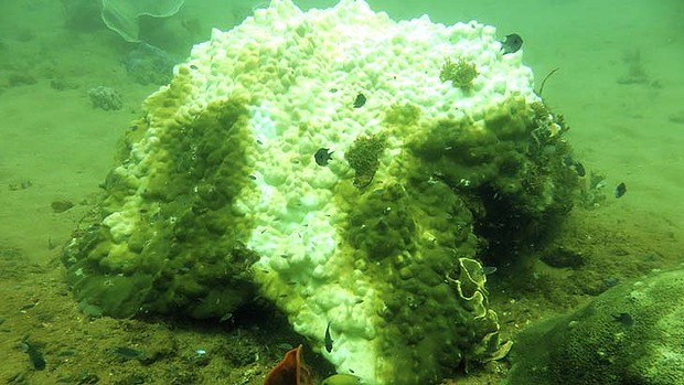 蒙特贝洛群岛附近一座古老的珊瑚头部被漂白。(自澳大利亚联邦科学与工业研究组织)